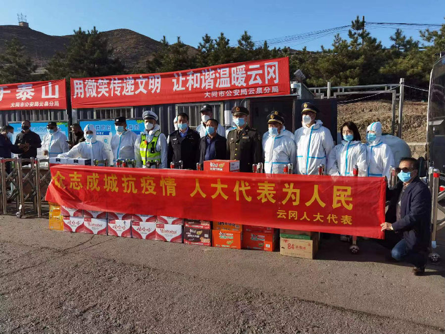 涓涓细流汇大海,点滴奉献成大爱。近日,由大同市云冈区人大常委会副主任王永兴带队的云冈区各级人大代表防疫爱心捐助慰问队,携带防疫物资赴大同市高铁站、飞机场、火车站、云冈区口泉高速口、平旺高速口、兴王高速口六大防疫卡口,看望慰问疫情防控一线工作人员,对各卡口工作人员坚持政治站位、强化责任担当、发扬连续作战工作作风,日夜坚守岗位,表达了衷心的感谢并致以诚挚慰问,为他们以实际行动守护辖区人民群众生命健康的奉献之美大力点赞。